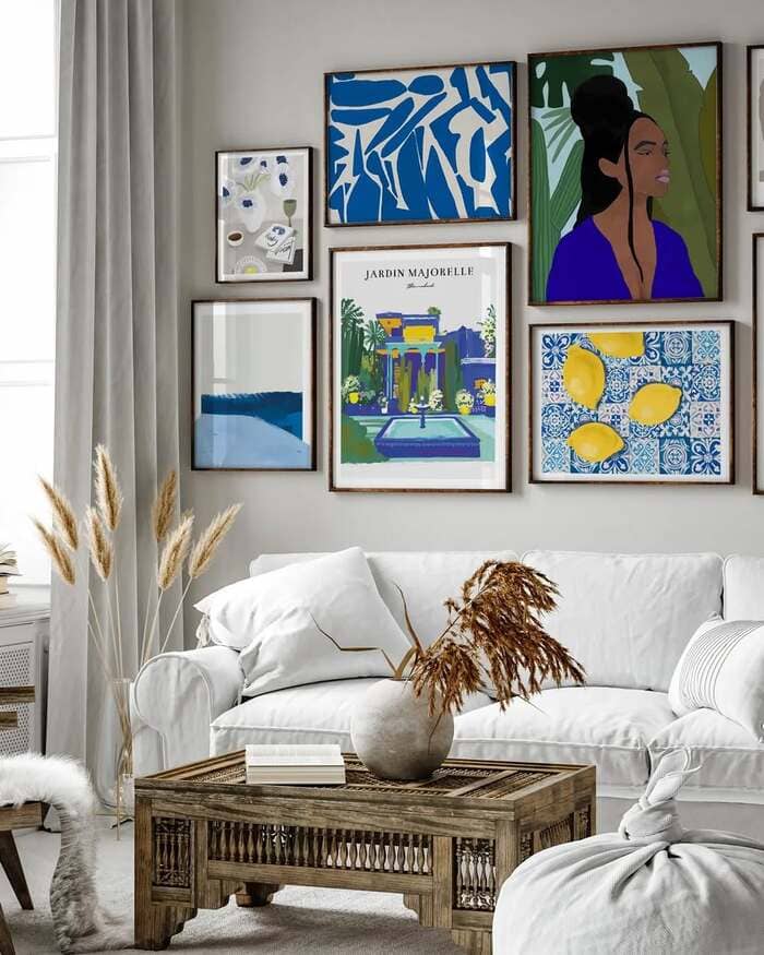 That blue and lemon wall above the white sofa is pure sunshine. If you love bold art, keep frames simple. I use slim wood frames with white mats so the color can sing without yelling. Start with the largest piece a hand above sofa height, then build outward like a puzzle.