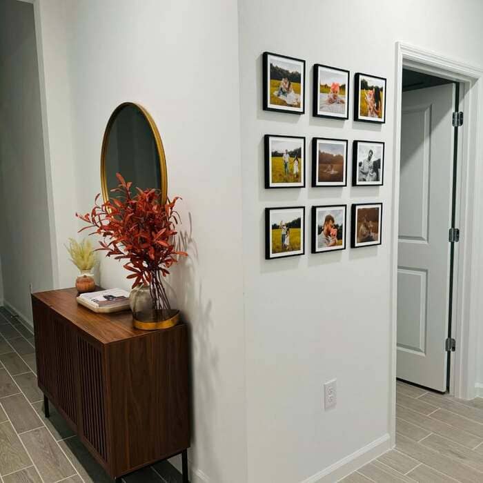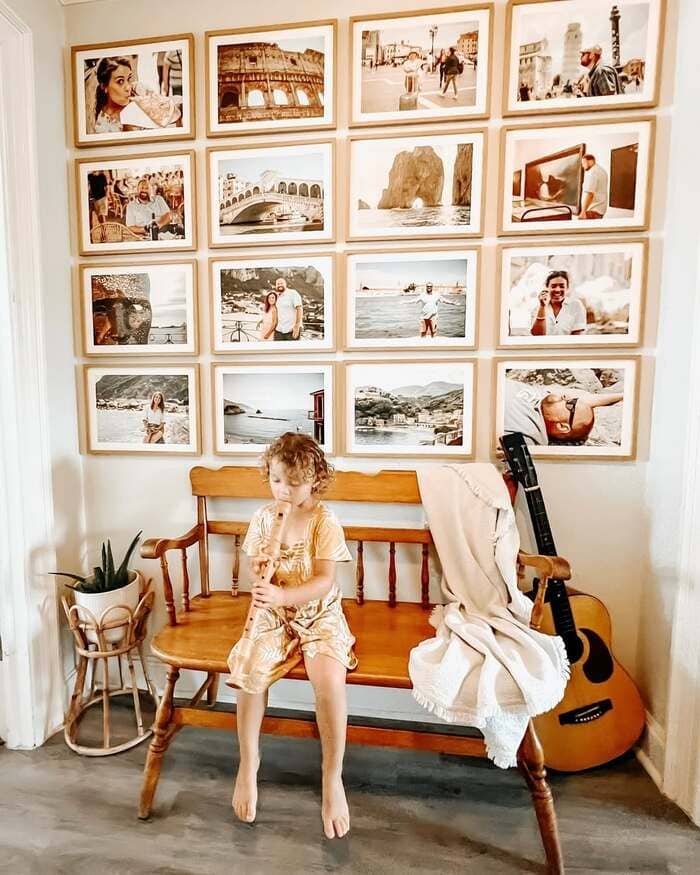 That grid of travel photos above the wooden bench owns the hallway. Use one frame style and a narrow gap around one inch. Crop all photos to the same ratio and keep horizons straight so it doesn’t wobble.