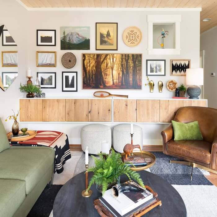 That living room with the glowing forest photo was saved to my phone in two seconds. Use one bold anchor, then surround it with art in different sizes and a couple round pieces. Round gives the eye a rest. Notice the frame finishes are cousins, not twins. Black, wood, and a touch of brass. That mix works because the mat colors are consistent.