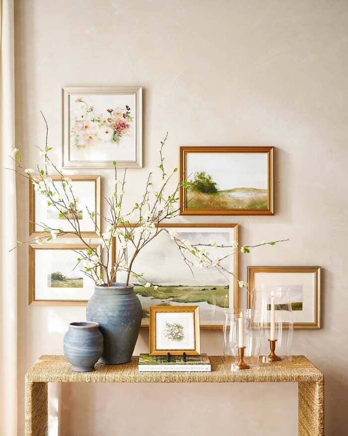 The grouping of florals and landscapes around a skinny console is the calmest moment. Use slim gold frames with soft art. Hang pieces so some edges overlap the visual shape of the console, not touching but close. That creates a pocket for your vase and candles.