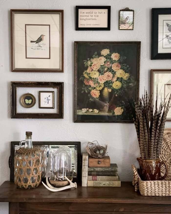 The vintage mix of birds, butterflies, and a tiny quote plaque is packed with charm. When you go heavy on small pieces, give them a simple rule. Same mat width across the set or same outer frame color. It lets your eye travel the wall without tripping. Layer the surface below with old books, a glass cloche, and something textured like wicker.