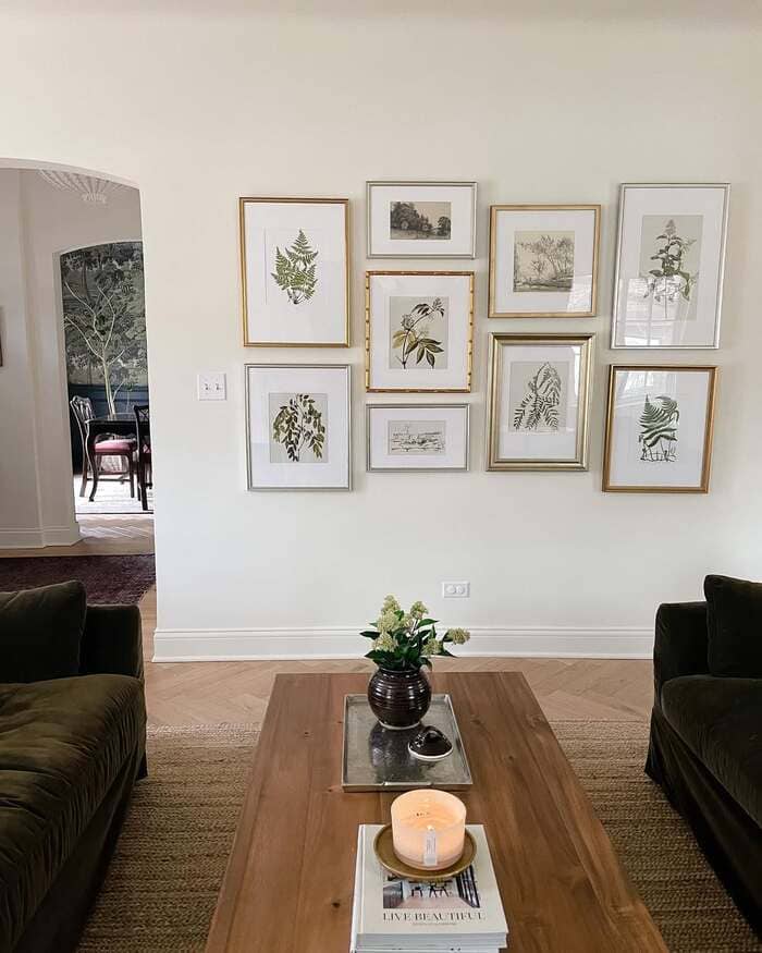 The botanical set with gold and silver frames is a great lesson in mixing metals. Put one dominant metal on the outer frames and let the inner ones be slightly different. The art shares a subject, which keeps it calm.