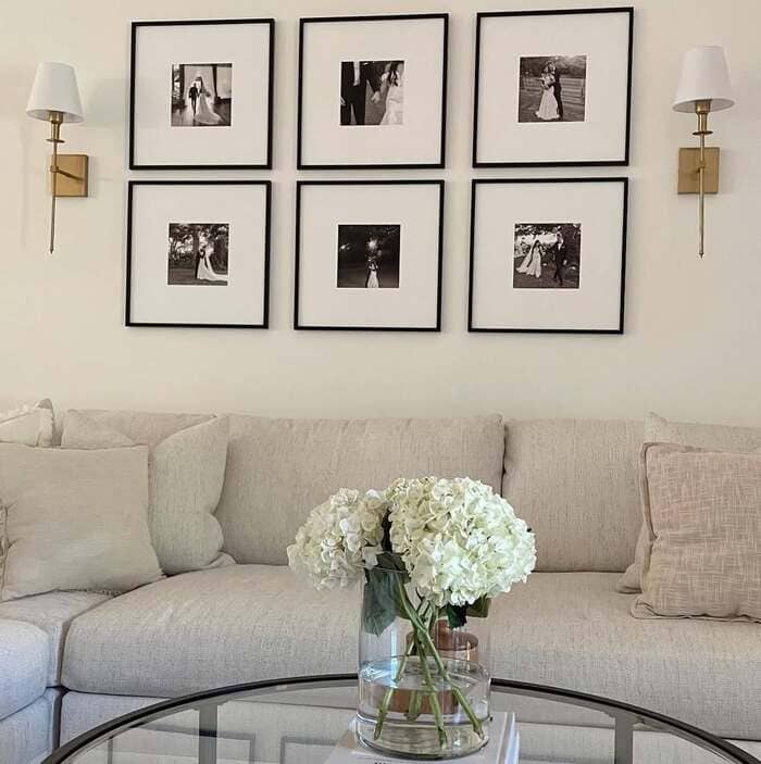 The black and white wedding grid teaches a calm lesson. Grids are soothing because your brain stops guessing. Make a paper template of one frame, trace it six times on kraft paper, tape them up, and adjust till the gaps match. Two inches between frames for small rooms, three for larger. Use thick mats so tiny photos feel important.