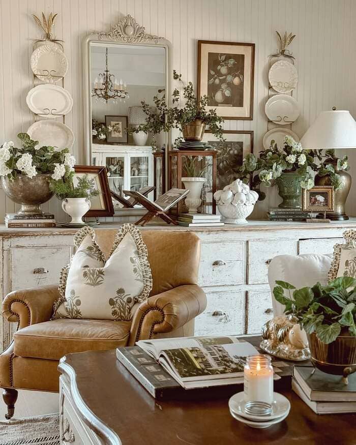 The room stacked with plates, a big mirror, and art leaning everywhere proves a gallery can be deep, not only flat. Stand a heavy mirror on a buffet and layer frames around it. Hang plate racks like columns on both sides and your wall turns into a happy shrine. To keep it from feeling stuffed, repeat green plants in three spots.