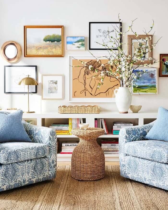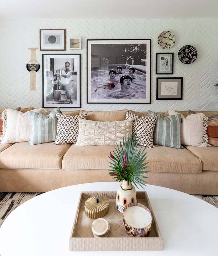 The neutral lounge with rope chain, basket tray, and soft art shows how texture can carry a story. If your prints are quiet, let mats and frames do the talking. Linen mats, wood frames, a woven tray, and one sculptural thing. That rope chain is weird in the best way and it makes people lean in.