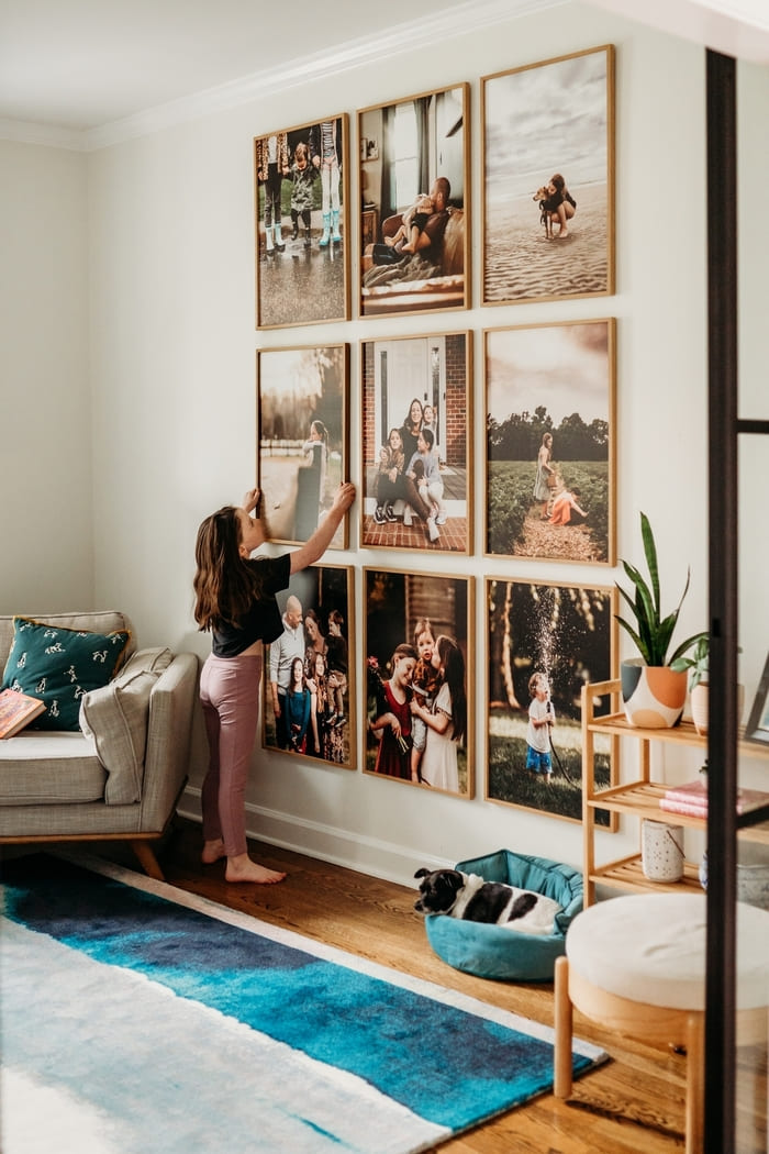 I print photos with a thin white border, mount them in identical frames, and keep the gap around one inch. Use a level once, then take a photo of the first row so you can match the second. Hang the grid close to a mirror or a round vase to soften the edges. It looks intentional, not corporate.