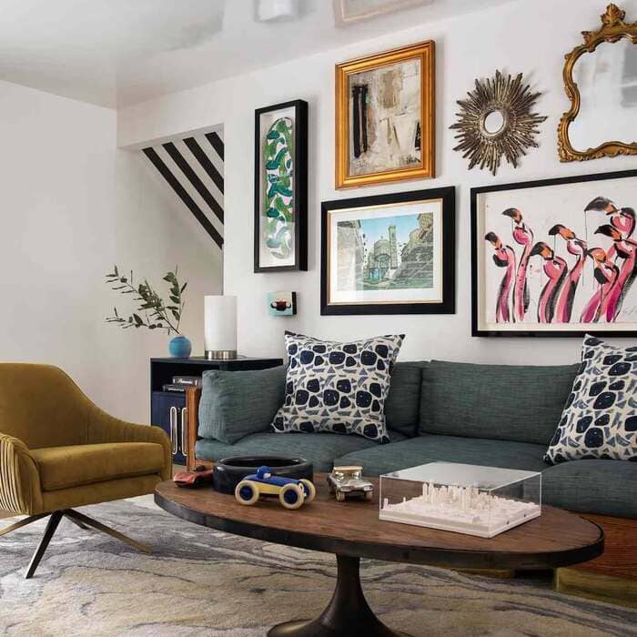 The teal sofa scene with a sunburst mirror, flamingo print, and abstracts shows a simple recipe. One vintage piece, one graphic piece, one mirror. Repeat mat color across everything to bridge frame finishes.