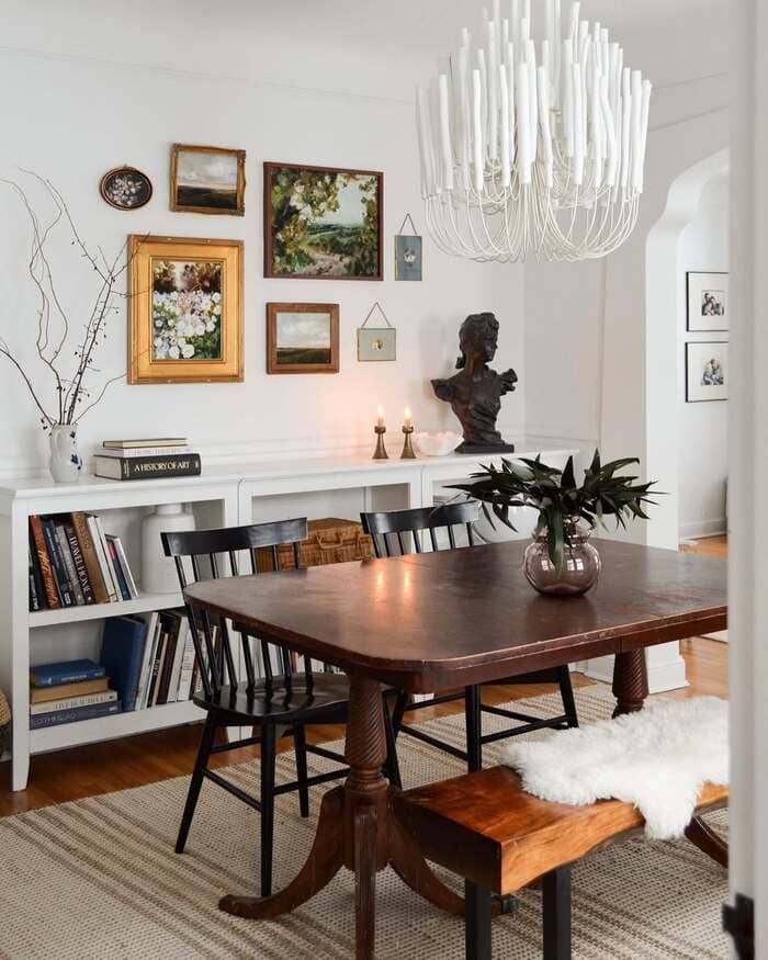 The dining room with little landscapes and florals proves small art can carry a wall. Group tight so they read as one. Use odd counts five or seven pieces. Lower the cluster slightly because you view art here while seated.