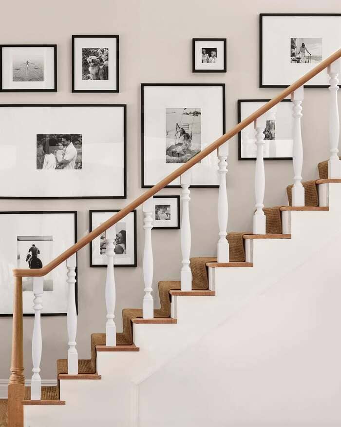 That stair shot is a master class. Black frames, thick white mats, soft neutral wall. Start by running a tape line that follows the angle of your railing. Align the centers of the frames to that line, not the bottom edges. It keeps the group rising in a friendly rhythm.