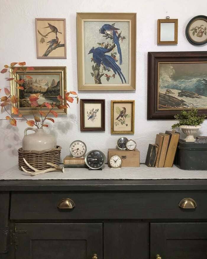 The vintage mix of birds, butterflies, and a tiny quote plaque is packed with charm. When you go heavy on small pieces, give them a simple rule. Same mat width across the set or same outer frame color. It lets your eye travel the wall without tripping. Layer the surface below with old books, a glass cloche, and something textured like wicker.
