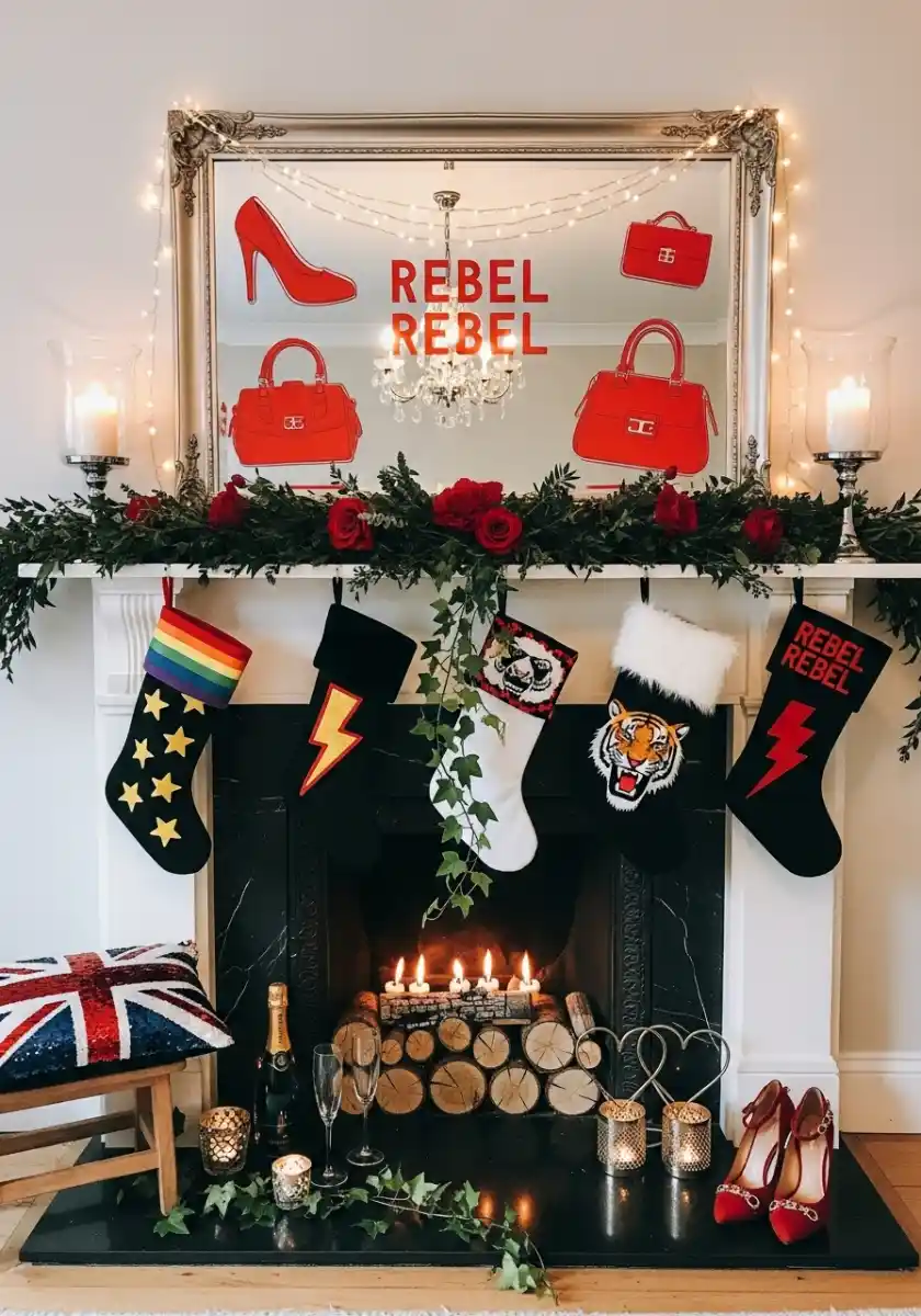 To get the look, keep the base traditional so the playful pieces don’t fight the room. Use a thick garland, then layer red roses and strands of fairy lights. Add stockings with personality patches, or DIY iron-on decals for your own “glam rock Christmas decor.” A pair of shiny heels or a vintage bag on the hearth makes it “glam fashion inspired holiday decor” and yep it’s a conversation starter. Guests always ask if they’re real shoes. They are, and I might wear them after dinner.
