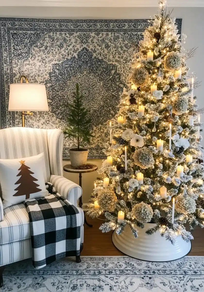 This tree glows like a winter chapel. I’ll admit, the candles got me first. They look real but they’re battery tapers and pillars clipped to the branches. Please do not use real ones on a tree. The flocking softens the whole shape and the white florals act like snow blooms. I tucked the tapers at different heights and pushed large faux hydrangea deep toward the trunk so the branches look heavy in a good way. The tapestry behind the tree adds pattern, so I kept ornament shapes simple. Pinecones, white baubles, and a few pearl drops keep it calm.