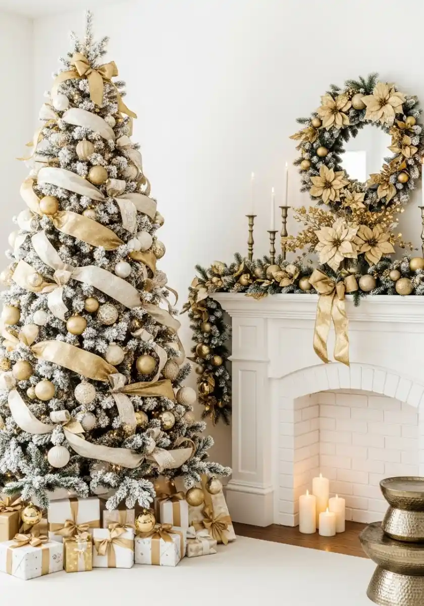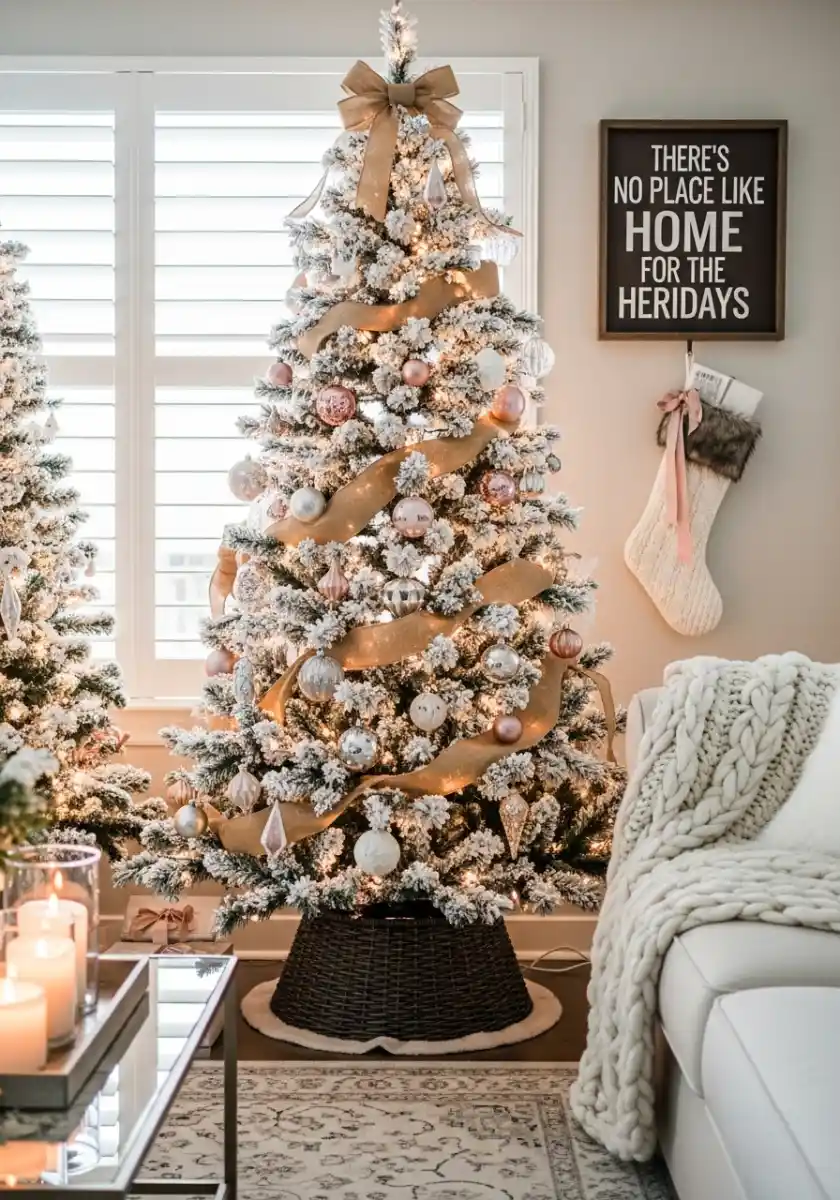 This tree proves you can be glam and friendly at the same time. Flocked branches wear wide champagne ribbon in gentle waves, with blush and pearl ornaments dropped in like sugar. A small sign on the wall reads there’s no place like home for the heridays. It’s a pun, yes, and it works because the palette stays chill. Nearby, a chunky knit throw makes the sofa scream nap time.