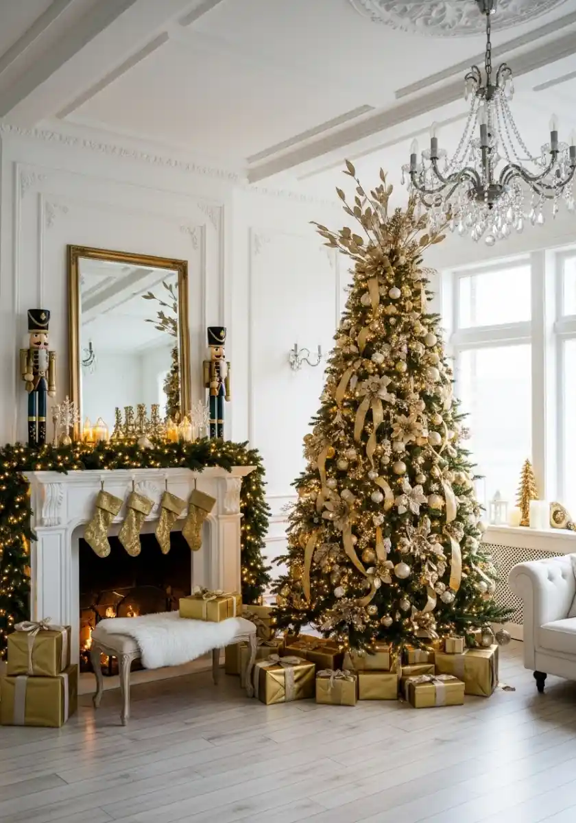 This room is straight from my grandma’s fancy dreams, and I’m not mad about it. Classic green tree, hundreds of warm lights, nutcrackers standing guard, and a fireplace wrapped in garland. To keep it from feeling heavy, I use lots of reflective ornaments and long gold leaves at the top as a crown. They frame the tree and pull your eyes up. I also love ribbon tails that swoop in big S shapes. Not perfect. Just soft curves.