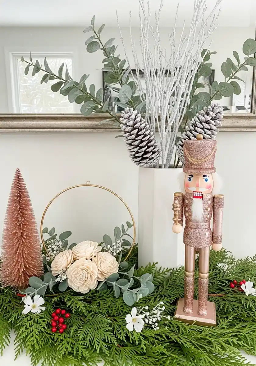 When I need fast style on a console or entry, I build a low bed of fresh cedar pieces. Then I drop in a few eucalyptus stems for round leaves. A glitter blush nutcracker stands tall as the star, with frosted pinecones and a pink bottle-brush tree for texture. The little hoop wreath with wood flowers is optional, but it softens all the sparkle and brings in that handmade touch.