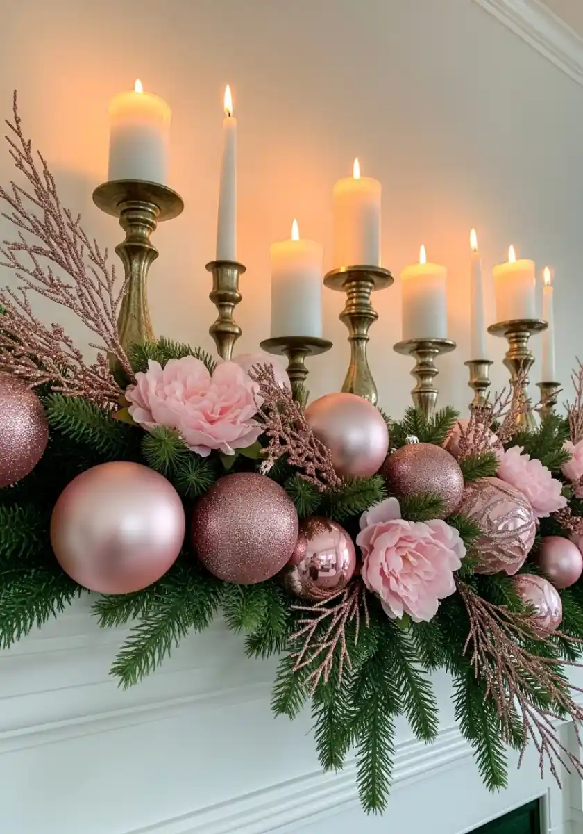 I didn’t know I needed pink peonies at Christmas until this mantel. Now I’m a believer. The secret is contrast. Soft blooms against deep green needles and hard brass candlesticks. I secure a base garland, then layer rose-gold branches and mixed pink ornaments. Large matte balls sit low. Smaller shiny ones perch higher where candlelight catches them. It reads lush and romantic.