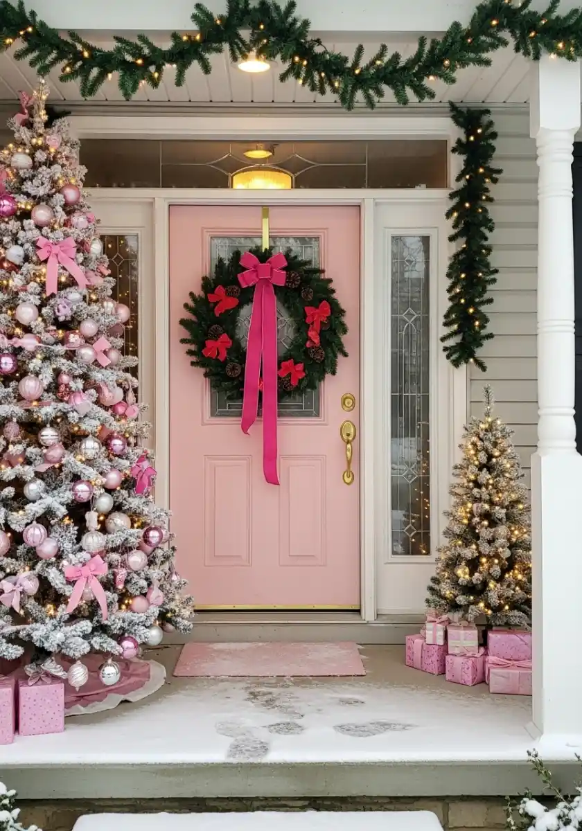 I cannot walk past a pink front door without smiling. Add two frosted trees and a wreath with a hot pink bow and you’ve basically made a Hallmark set. Start by framing the door with a simple green garland and warm lights. Then go heavy with pink ornaments on the main tree so the door color looks intentional. Repeat the bow color on the wreath and on a few gifts stacked near the step.