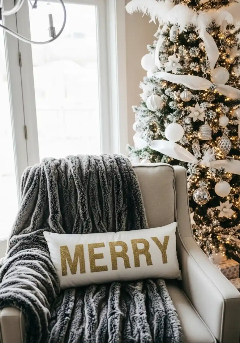 Sometimes the glam is more about touch than flash. A soft faux fur throw on a neutral chair, a long lumbar pillow with glitter letters, and a tree with feathery topper and white ribbon. The palette is winter whites and a hint of gold. I like using oversized ribbon loops instead of bows. Easier and modern. The feathers up top feel like a snow crown.