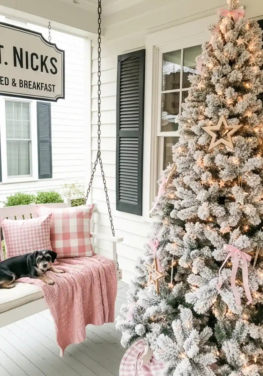 This porch is small, so the details matter. A flocked tree covered in wooden star ornaments and pink ribbons sits beside a white swing with gingham pillows. It’s sweet but not childish. The pink knit throw adds texture and keeps the dog happy. I tied ribbon ends into tiny fishtails to look finished, then hung a few star ornaments from the swing chain to pull the scene together.