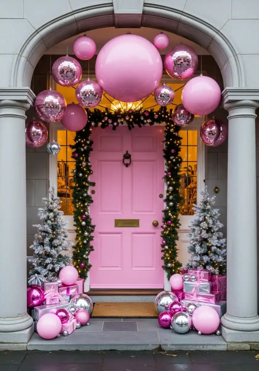 It’s a showstopper. Pink door, disco balls, and glossy balloons in different sizes floating above the entry like Christmas confetti. I build a garland frame first, then attach clear hooks for the balloons so I’m not fighting the brick. Use a mix of mylar spheres and mirror balls for depth. Cluster them in odd numbers. The sides get mini trees and stacks of silver and pink gifts for balance.