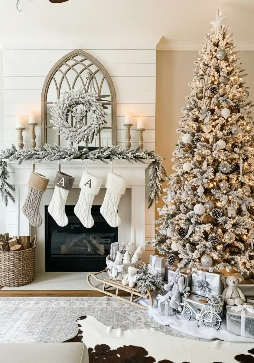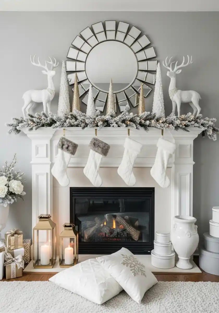 This mantel is such a clean breath. White deer, frosted greenery, and a row of cone trees in snow and champagne under a round mirror. The symmetry makes my brain happy. I keep the stockings white with a hint of faux fur so texture does the work. Tall lanterns with candles on the hearth add glow but also height, which balances the big mirror circle above.