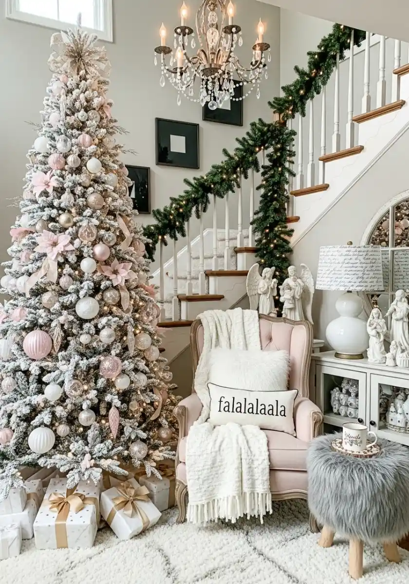 This design whispers romance. A flocked tree with blush ornaments and toasty champagne baubles sits by a crystal chandelier and a simple garland on the banister. It’s elegant but not fussy. I like bigger ornaments near the trunk and the delicate floral picks toward the tips, which makes depth without overthinking. The chair with a fluffy throw and a silly “falalalaala” pillow is the invitation to sit and hum carols even if you sing off key like me.