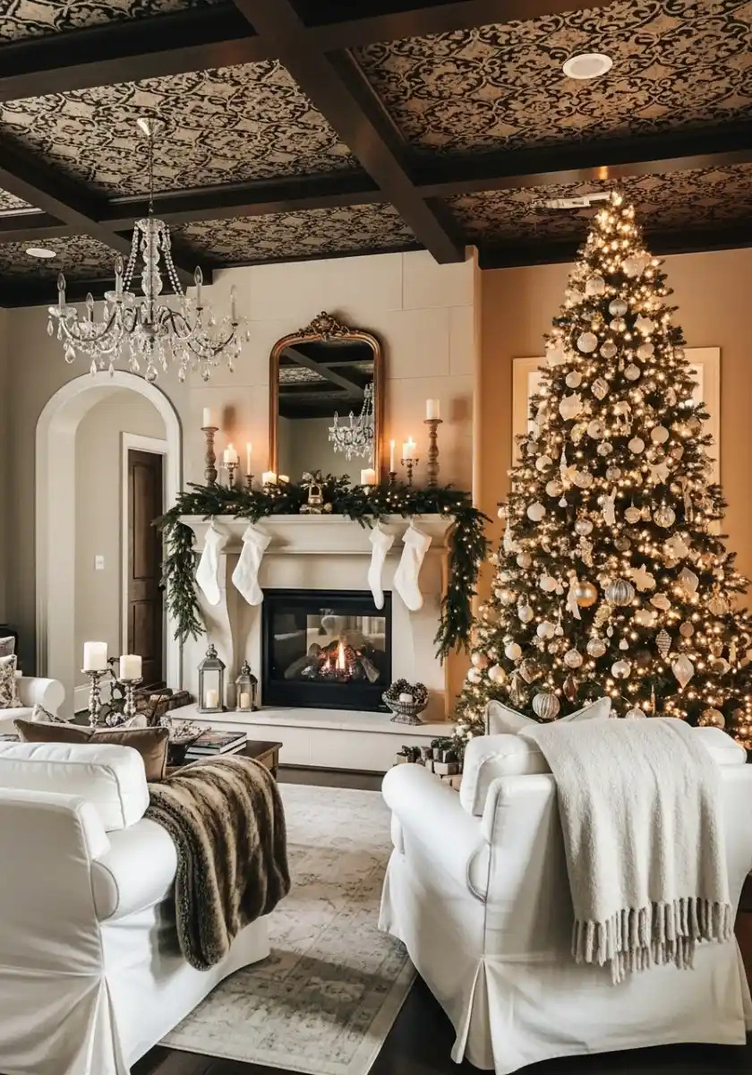 To build similar glam christmas decor, start by editing. Remove half the usual decor, then add only pieces that fit your story. I anchored the mantel with fur-trimmed stockings and used real cedar mixed with faux for scent. On the tree, I tucked big blooms deep to hide light cords, then added icicle ornaments near the tips. The result is glamorous holiday decorations that seem expensive but rely on simple repeats. If kids live here, store toys in white baskets under the sideboard so the view stays clean at party time.