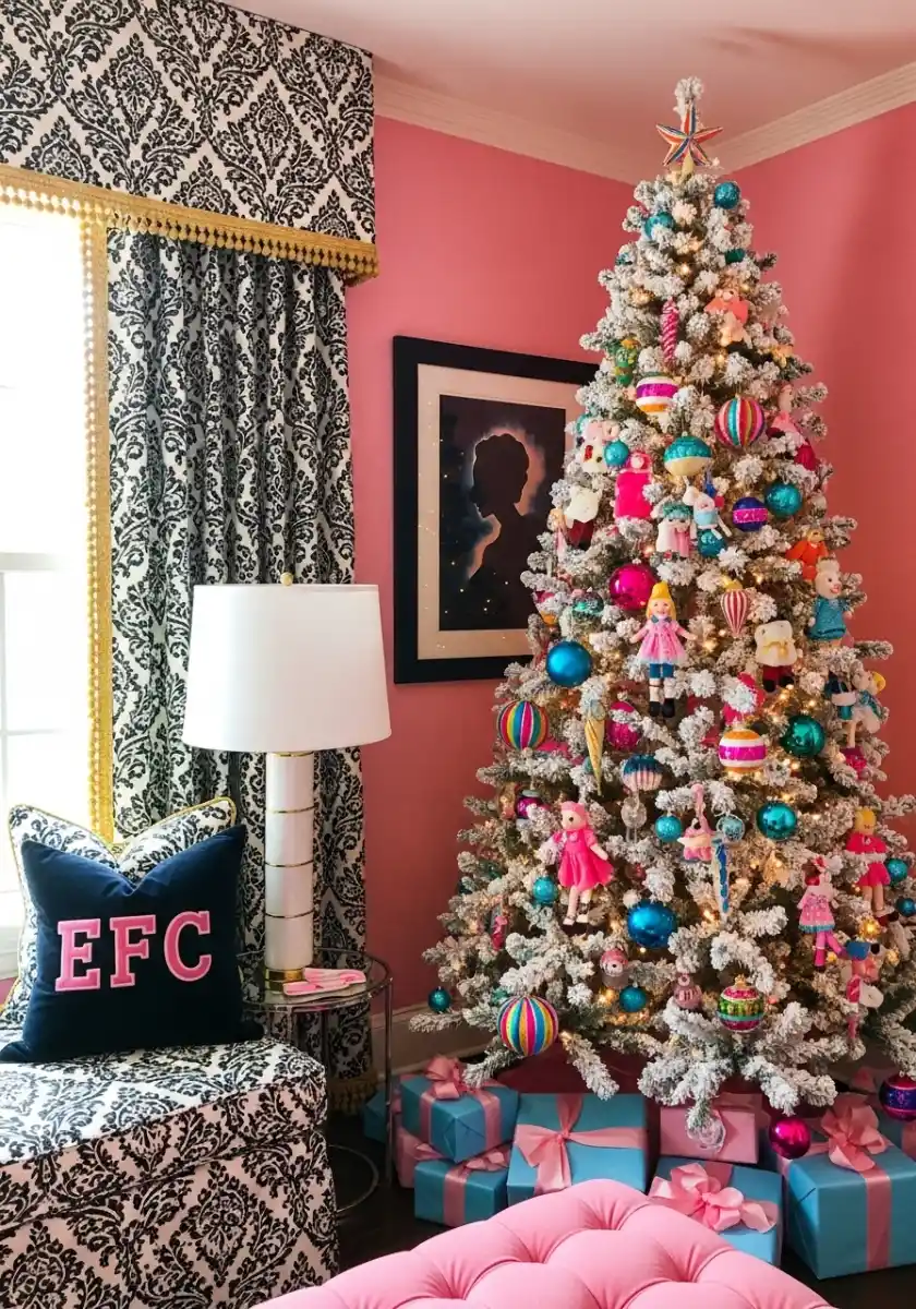 This tree is pure joy. Hot pinks, teals, dolls, nutcrackers, hot air balloons. It’s like the toy aisle decided to be chic. The trick is repeating shapes. See how the big teal balls anchor the color story while the smaller candy ornaments fill space. If you love color but worry about mess, this is your sign. I add bright ribbon curls and tuck them inside the branches so the color pops without covering everything.