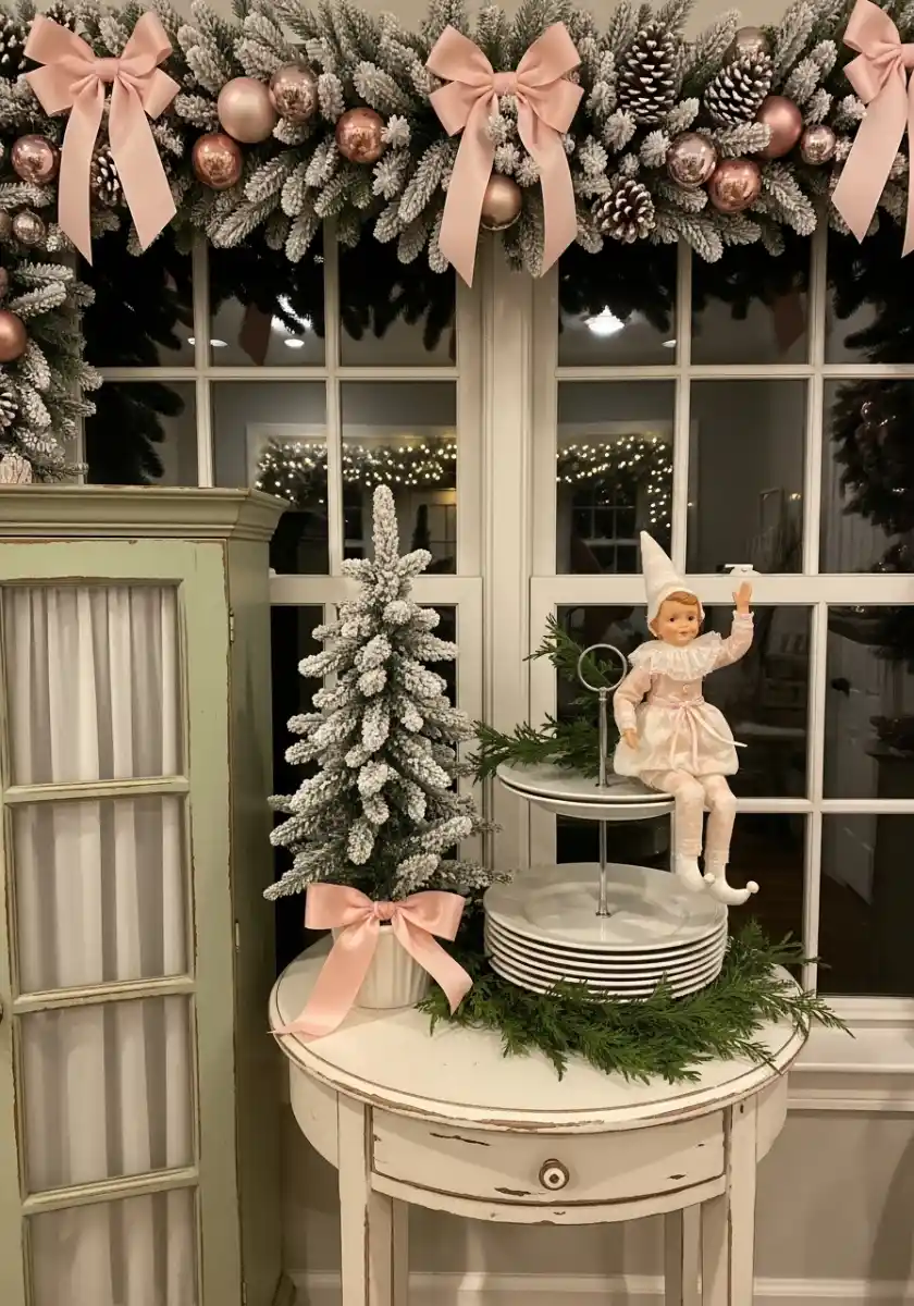 I’m a bow person now and I didn’t see that coming. Over a big window, a frost-dusted garland gets dotted with rose gold ornaments and neat blush bows. Below it, a mini flocked tree wears a matching bow like a hat. The vintage porcelain elf sitting on the plate stand is quirky and I’m here for it. The green cabinet and chippy table keep the scene from feeling too perfect.