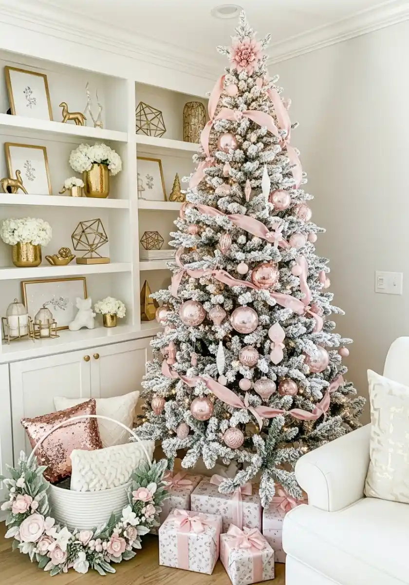 This frosted tree is soft as a whisper. Pale pink ribbons wander around the branches and big blush ornaments echo the curve. Nearby shelves hold white and gold objects so everything feels curated. I like a single statement topper, here a large soft flower that almost glows. The gifts in tiny floral wrap repeat the theme without shouting.