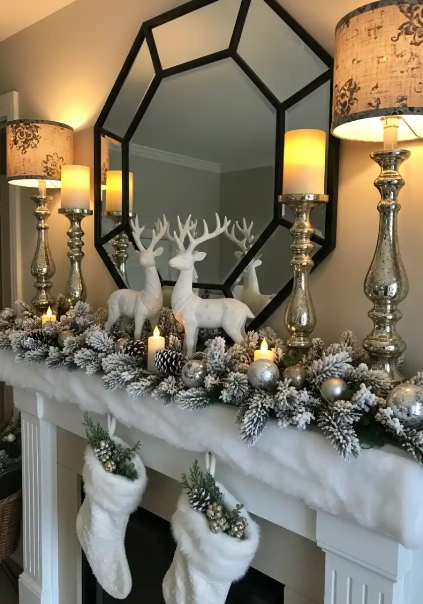 You know that moment when a room feels like a snow globe? This mantel does that. A strip of faux fur runs the full length like fresh snow. On top, frosted garland, silver ornaments, and mercury glass candleholders sparkle against a dramatic mirror. Two white deer stand in the middle and the stockings have greenery tucked inside so they feel alive. I promise, it’s easier than it looks.