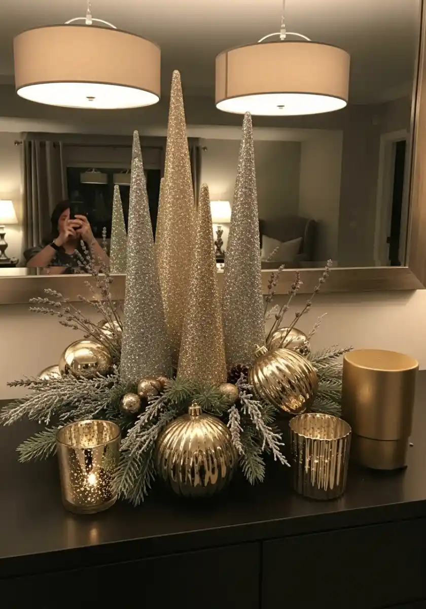 This is the fastest glam holiday decorations project I know. Keep the cones odd in number, like five or seven, and vary heights. If your mirror sits behind, the whole arrangement doubles. For glam Christmas theme parties, do two matching forests at buffet ends and let the food be neutral in white dishes. Your guests will think you planned for weeks. I will not tell them you built it five minutes before they rang the bell.