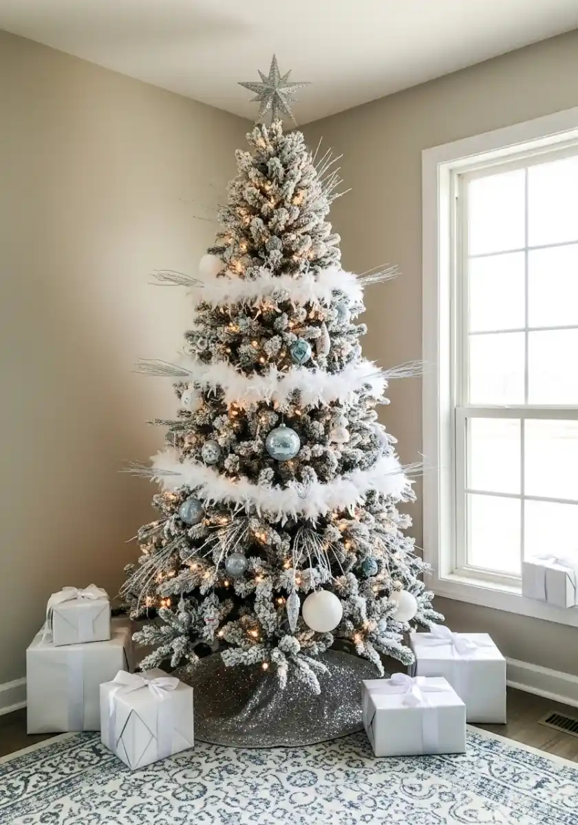 For “glam Xmas decor” on a budget, buy craft-store boas and wire them end to end. Stick to icy neutrals silver, pearl, and a tiny drop of blue. I pepper in long silver picks that shoot out like fireworks because the shape adds height. If you’re renting, try a removable hook for the star so you don’t crunch the flocking. This is also perfect “glam winter decor” for January when you’re not ready to take the tree down yet.