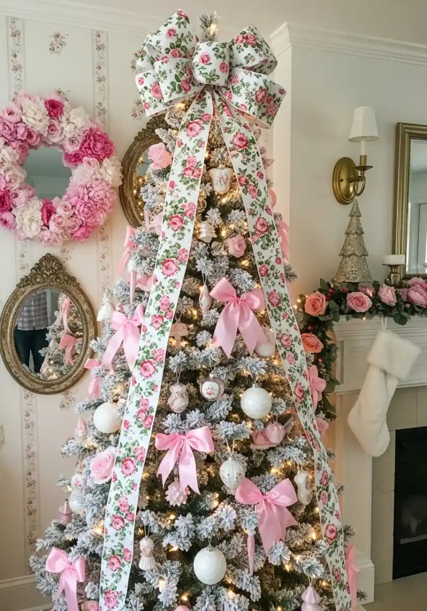 Please allow me one over-the-top moment. This tree wears a giant floral bow that cascades to the floor and I’m a tiny bit obsessed. Pink bows fill the rest of the branches with big white ornaments spaced to breathe. On the wall, vintage mirrors and a fluffy rose wreath add romance. The mantel nearby has matching florals so the room reads like a storybook.