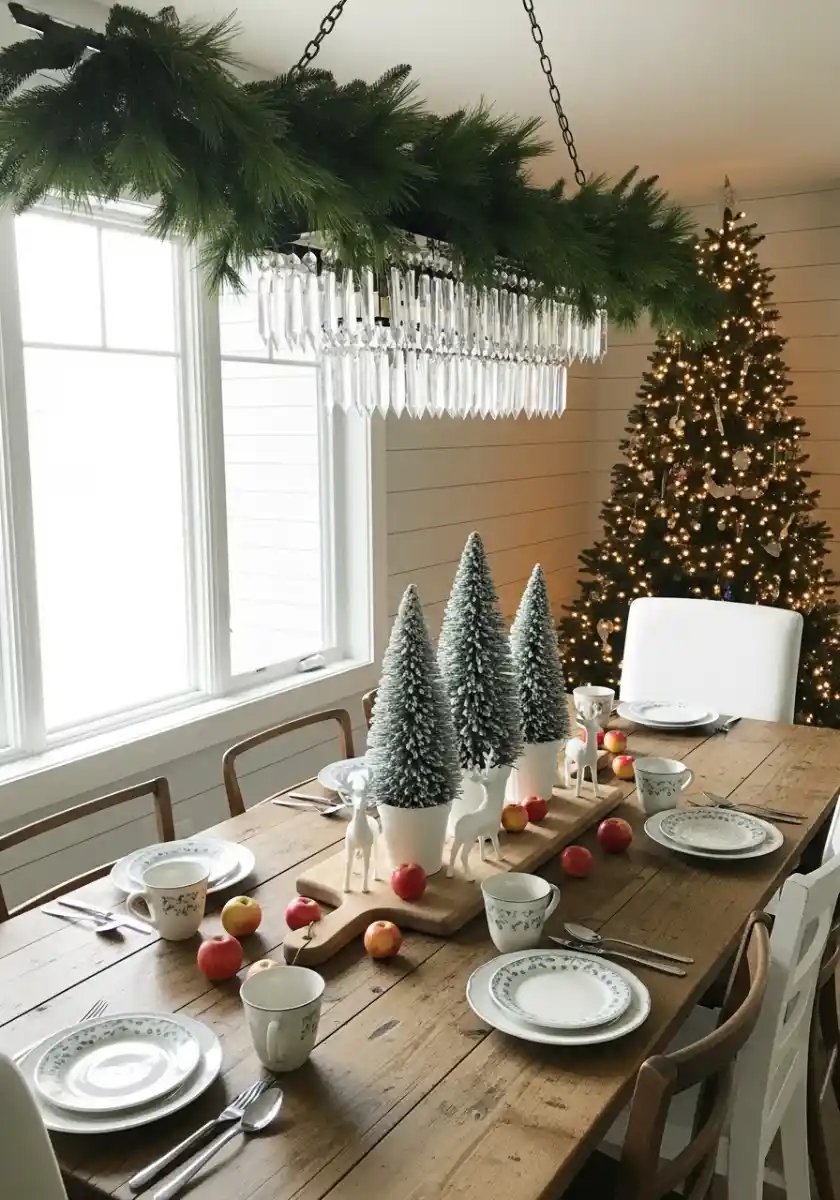 This dining setup feels crisp and calm, like fresh snow outside a cabin. A crystal chandelier wears a blanket of pine, which is a simple trick that reads fancy. I zip-tied a faux garland around the bar, then tucked in fresh sprigs for scent. On the table, a wooden board runs center stage with a row of flocked bottle-brush trees in plain white pots. A few ceramic deer and scattered apples give soft color while keeping the centerpiece low, so you still talk to the people you like.