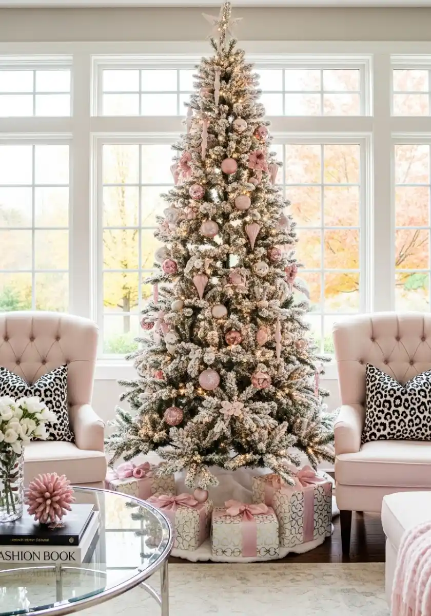 To copy this glamorous Christmas decor at home, spray a basic green tree with a light rosy flocking spray or choose a ready-made pink one. Stick to three finishes for ornaments matte, glossy, and glitter so it doesn’t get chaotic. Wrap gifts in tonal pinks and tie with white organza ribbon for a calm foundation. Variation ideas to try: “glam holiday decor” with velvet bows, or “glamorous festive decor” by tucking in tiny crystal picks near the lights for extra sparkle.