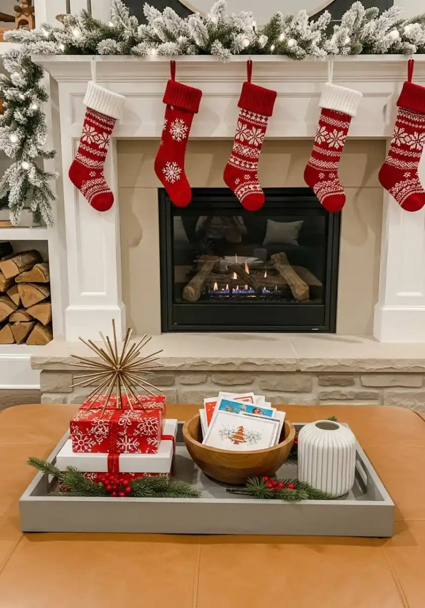 Sometimes the classic red wins, and I’m not mad. A frosted mantel garland sits high and full, then five knit stockings swing in perfect rhythm. On the coffee table, a low tray holds wrapped gifts, a bowl of cards, a ceramic vase, and berry sprigs. It feels neat, which my brain loves during busy weeks.