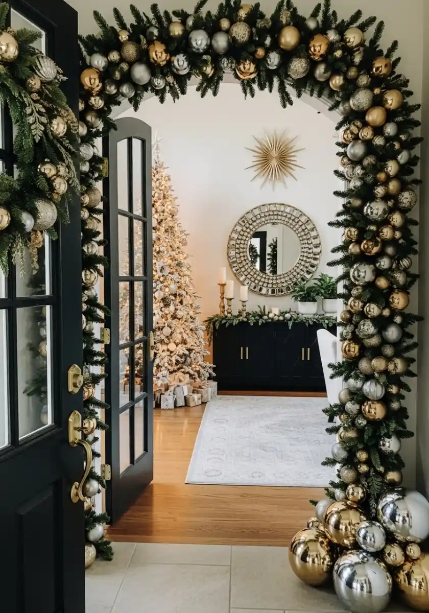 This door arch is a showoff and I love it. Dense greenery stuffed with gold and silver balls wraps the doorway and puddles at the base with oversized ornaments. Past the doors, a sideboard with a mirror and candles continues the glow. The repetition is what sells it, from the starburst on the wall to the bauble mix along the garland.