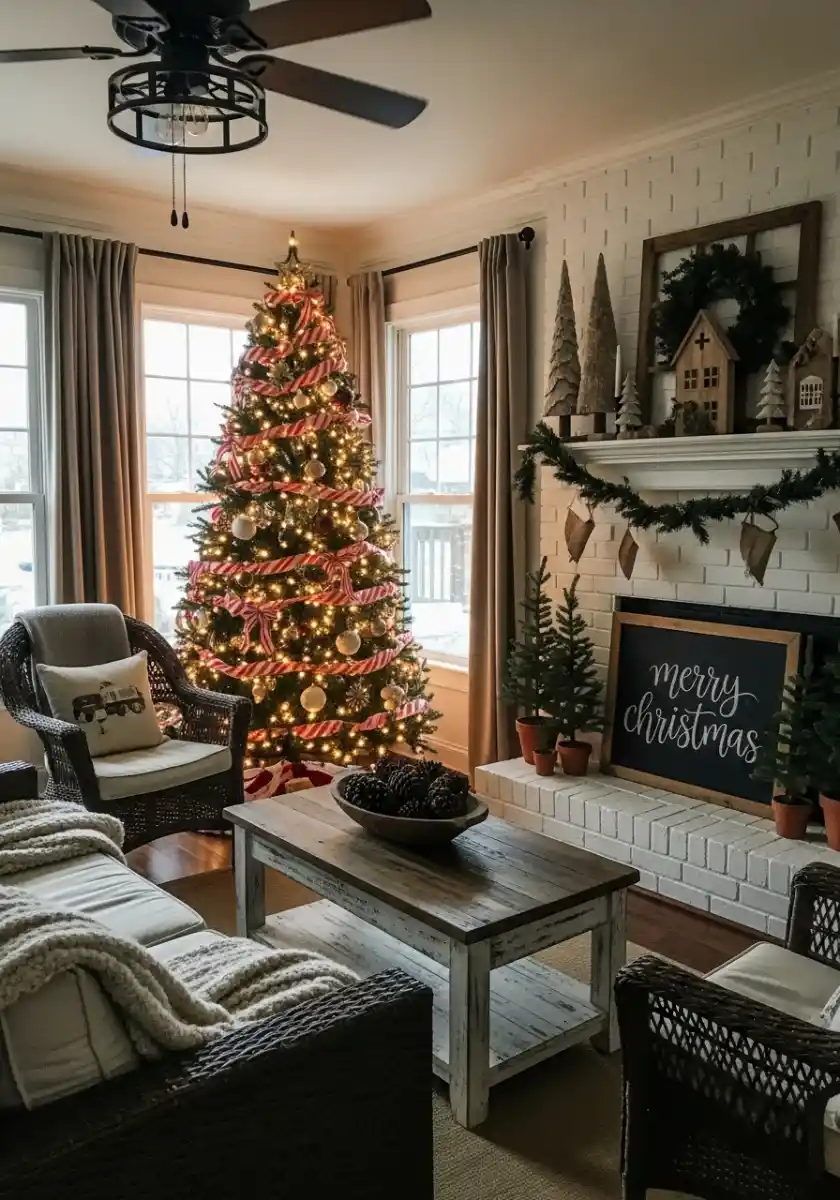 Here’s the tree that stole my heart because it’s happy and a little imperfect. A green tree with candy-stripe ribbon swooping all the way around, gold balls, and warm lights. The room has wicker chairs, knit throws, wood houses on the mantel, and a sweet chalkboard that says merry Christmas. It’s nostalgic, but not dusty.