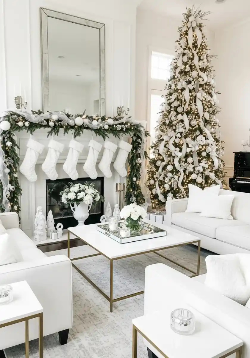 White-On-White Salon With Grand Tree And Mirror Mantel