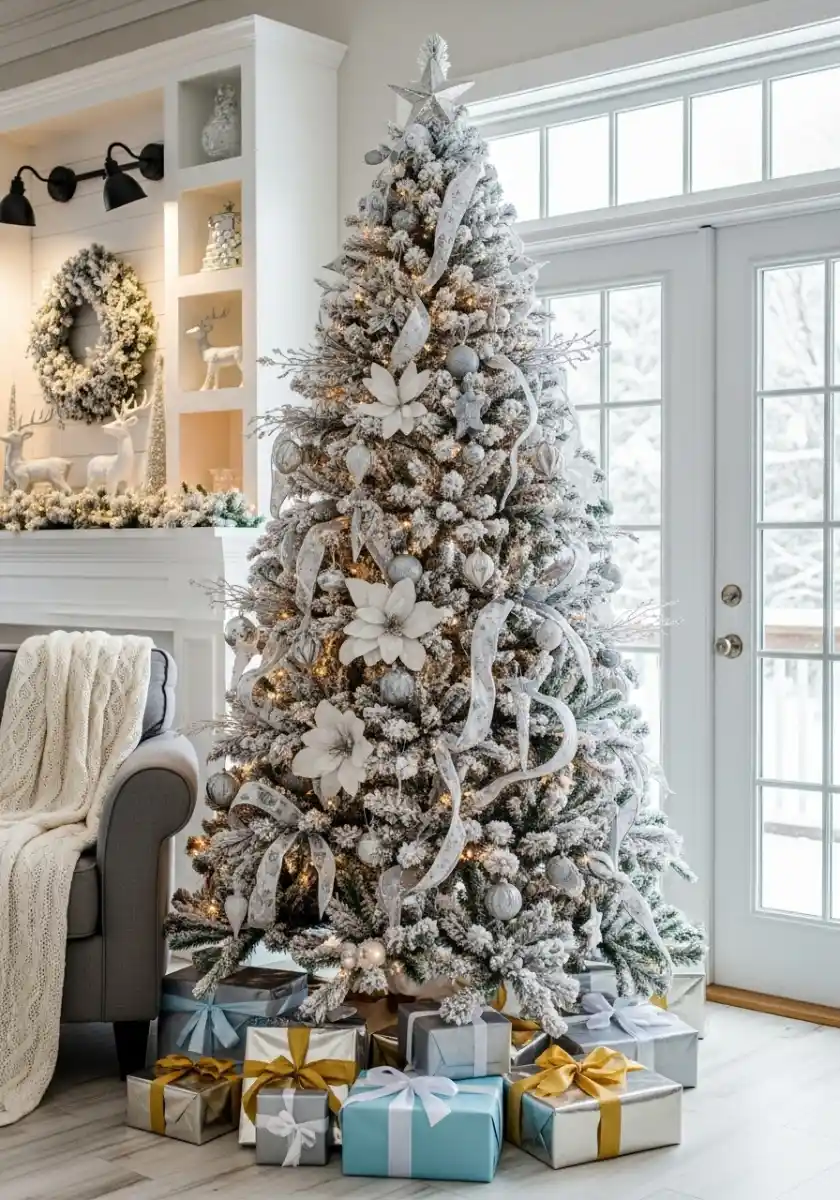 The last scene might be my favorite because it’s icy and bright. A flocked tree carries silver baubles, white floral picks, and ribbon that curls like party streamers. Underneath, gifts are wrapped in silver, gold, and a few turquoise boxes that pop, then tied with white bows. The built-ins next to the fireplace repeat white deer, wreaths, and tiny cone trees which keeps the room cohesive.