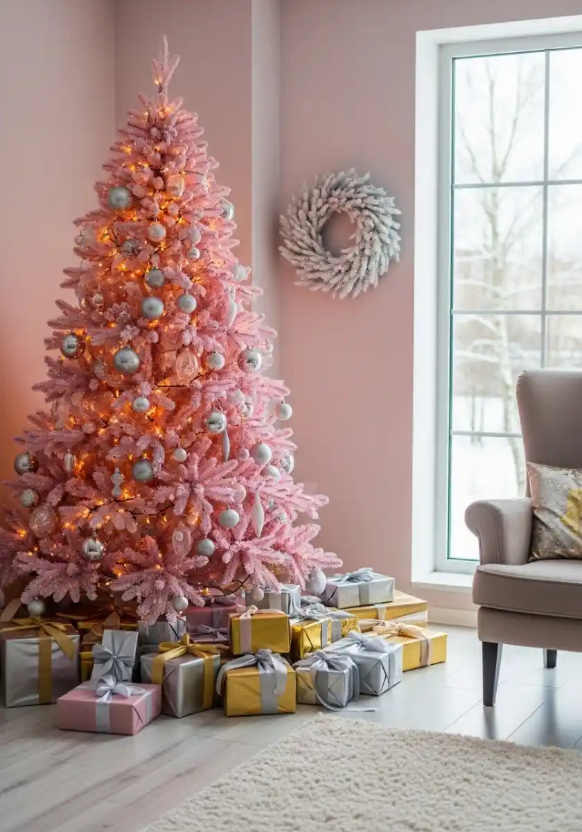 This soft pink tree is all about glow. Warm fairy lights, metallic champagne ornaments, and glossy silver bows create that sugary, movie-scene vibe. I like using two light strands warm white and a teensy strand of twinkle set to a slow shimmer. It keeps the room calm. With glam christmas decor like this, lighting is your best friend.