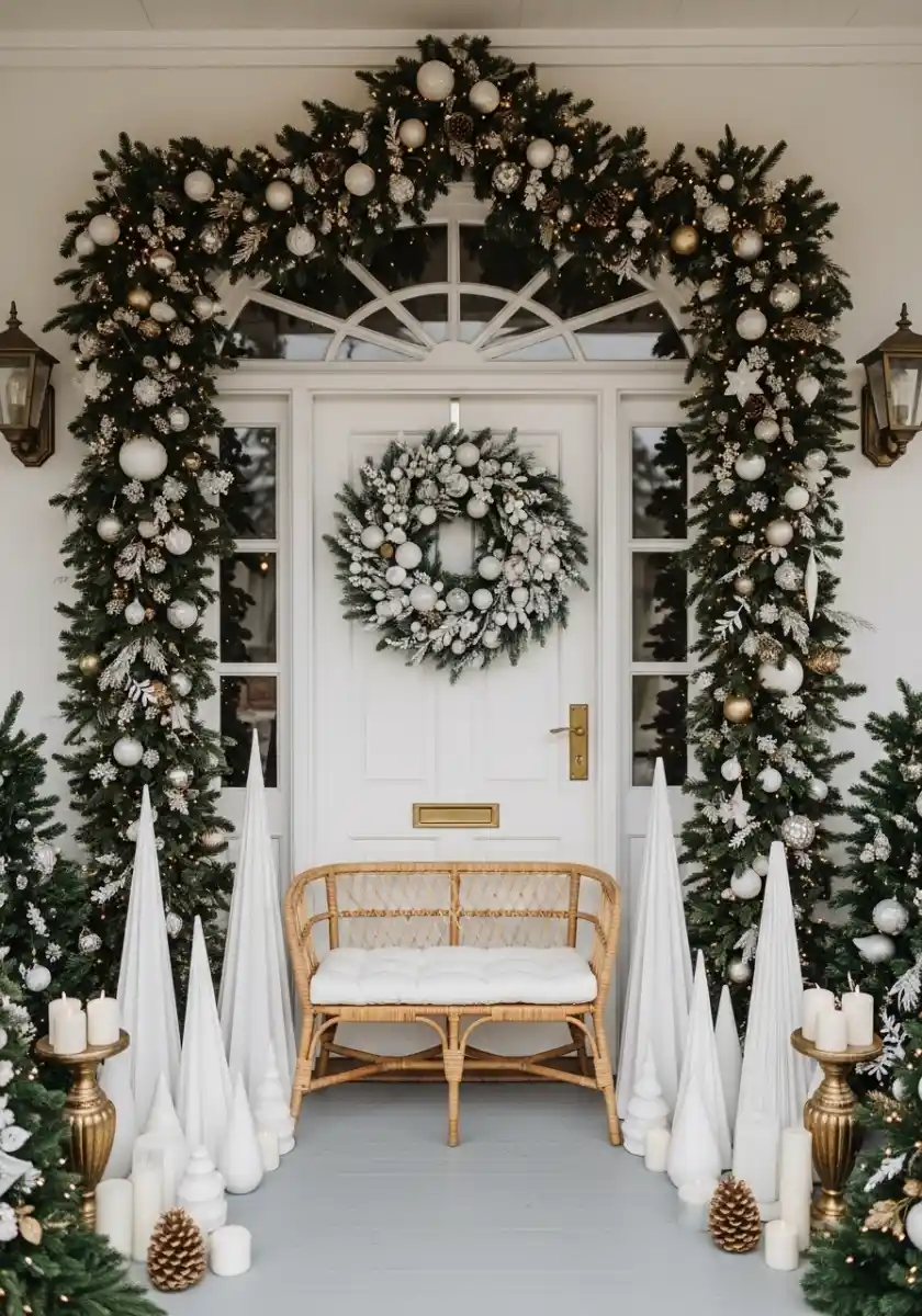 I’m obsessed with the entrance shot because it shows how glam christmas decor can start before you even open the door. A beefy garland arches over the frame with white ornaments and frosted sprigs, then a circle wreath sits right in the center. On the floor, tall white cone trees feel like modern sculptures. It looks expensive but you can cheat it.