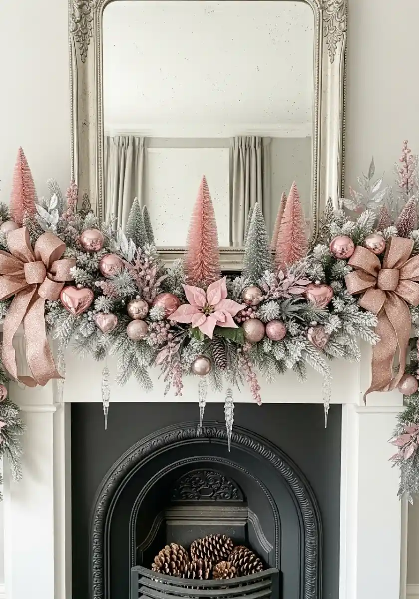 The blush and silver mantel might be my favorite to copy because it’s simple parts multiplied. You’ve got frosted greenery, bottle-brush trees in pink and sage, big satin bows, and a line of ornaments tucked inside the branches. The whole thing screams glam christmas decor but it’s soft enough for tiny apartments. I keep the bows extra long and let the tails drift because it feels romantic.