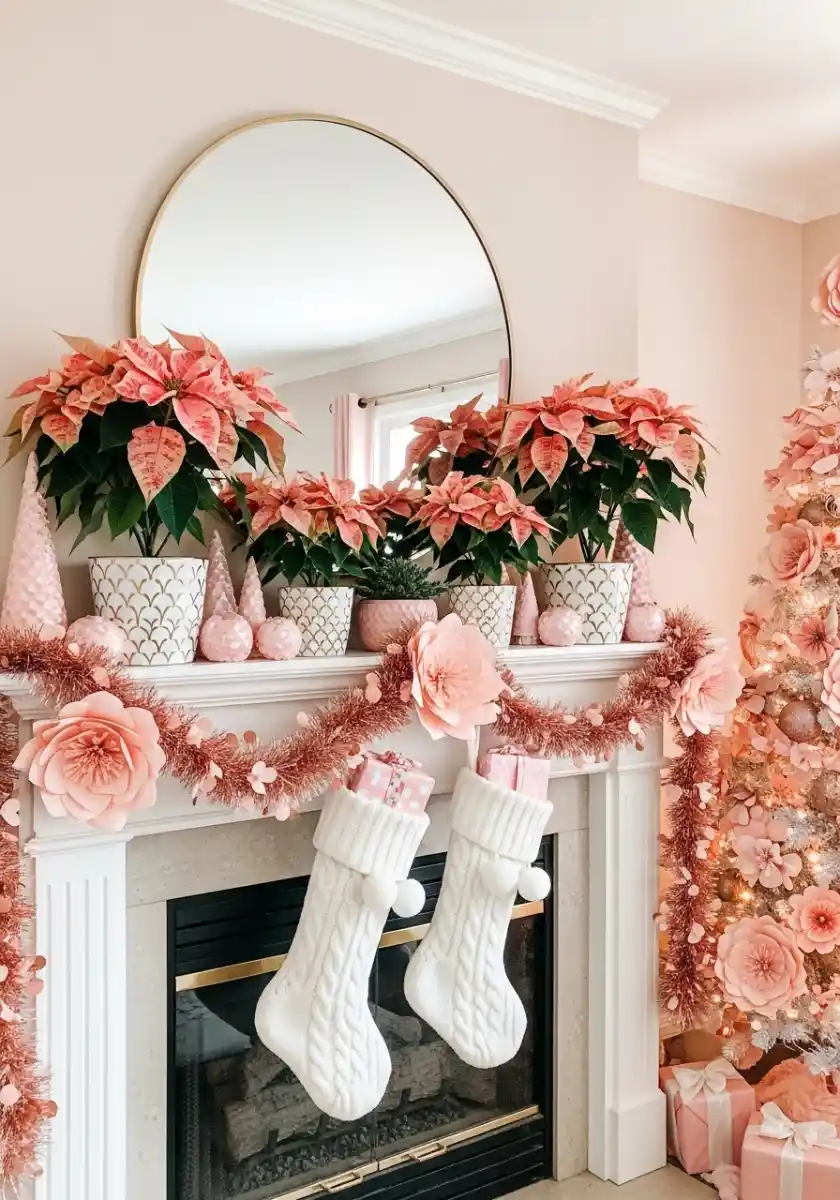 This idea gives happy party vibes. Peachy pink poinsettias in patterned pots line a mantel, with a rose tinsel garland looping across and paper flowers to match. It’s not shy and I love it for kid spaces or for a living room that needs a grin. The knit stockings keep it grounded so your glam christmas decor still feels cozy.