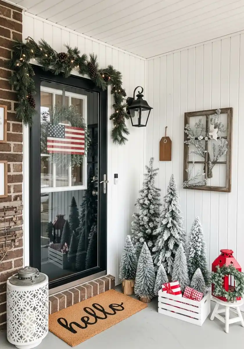 To keep it practical, place the mini trees in weighted planters so the wind doesn’t send them down the street. Wrap a short garland over the door and twist in pinecones for texture. A coir doormat with a friendly word sets the tone. Want “glam outdoor Christmas decor” without power outlets? Use rechargeable puck lights hidden in the lantern and inside the crate. That warm glow plus frosted tips equals “glam winter holiday decor” with zero tangled cords.