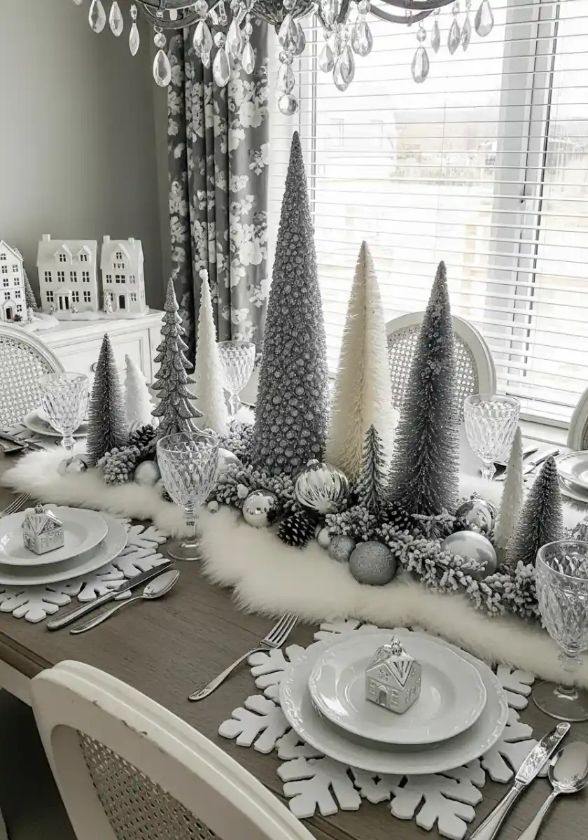 For “glam Christmas tablescape” that’s still easy to eat around, keep the tallest trees in the center and taper down near plates. Snowflake placemats pull the theme without more clutter. I like adding one tiny house ornament on each plate as a favor. It’s thoughtful and doubles as “glam holiday tables” decor. If you want warmth, switch glass for wood chargers to balance the cool tones.