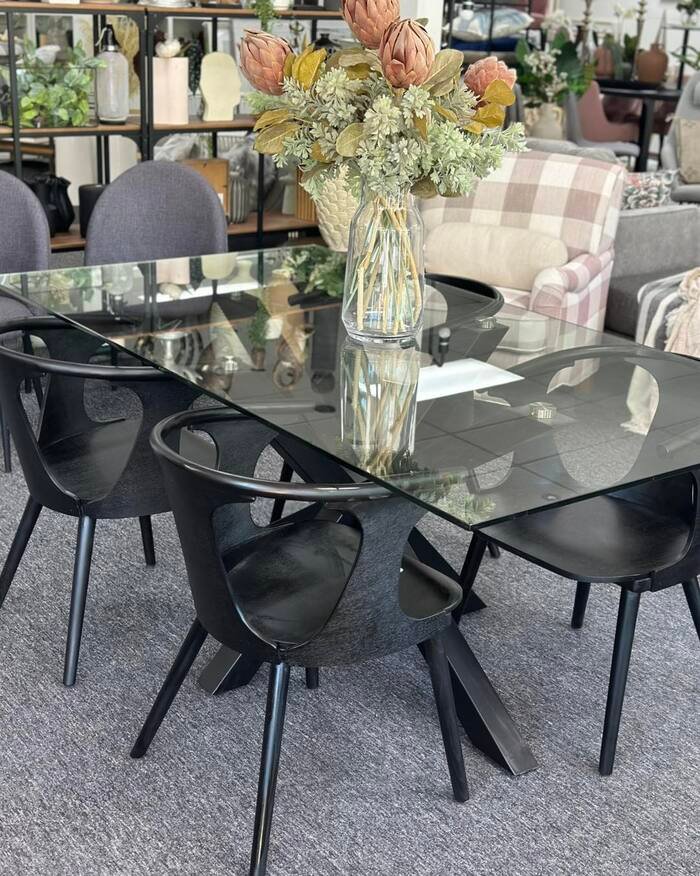 Dark chairs + soft florals for glass dining room table decor that feels cozy, not cold