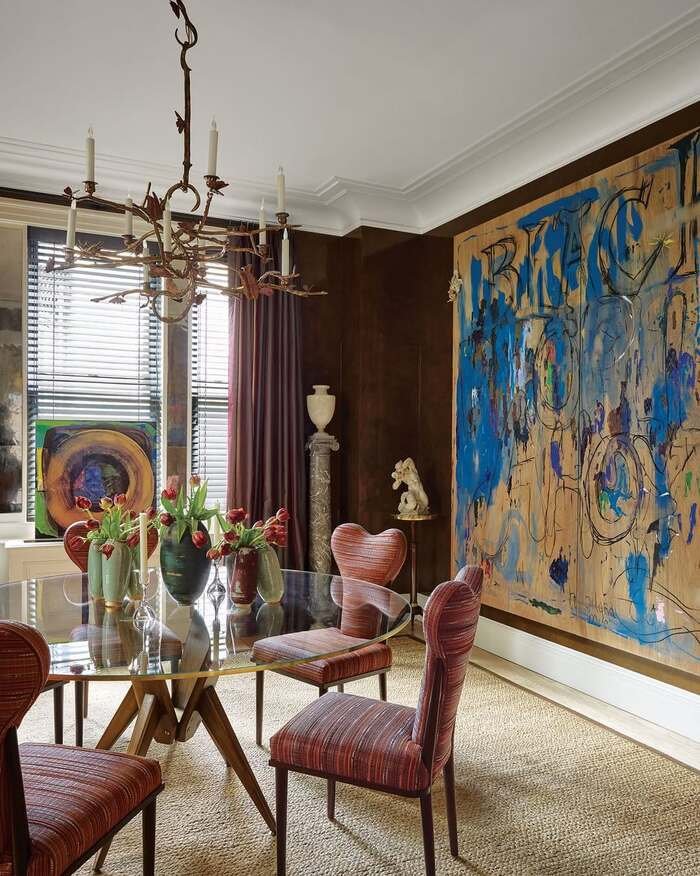 Okay this one made me stop scrolling. It’s a round glass table with white chairs, and behind it there’s huge colorful art. Like, the art is loud in a good way. The glass dining room table decor is also bold, with one big sculptural centerpiece that sits right in the middle. It’s not small and delicate, it’s a statement.