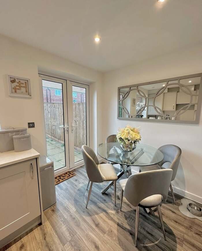 This room feels modern but still comfortable. It’s a rectangular glass table, and the chairs are slim and white, kind of sporty looking. The gray accent wall is doing a lot, and there’s a tall arched mirror leaning like it’s casually cool. Over the table, three pendant lights hang in a row, which gives it that “designer” look. The glass dining room table decor is simple, like a small centerpiece on a tray, and maybe a tiny vase.